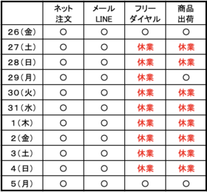 1/2 金曜 年末年始休暇(メールとLINEのみ対応可能)